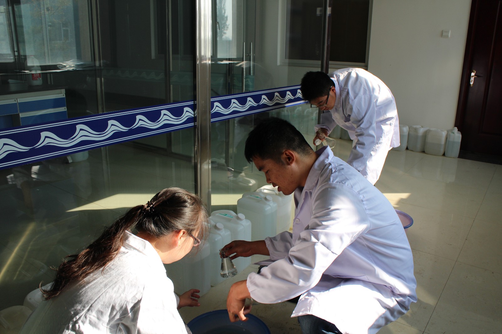 實(shí)驗(yàn)人員采集水樣準(zhǔn)備進(jìn)行檢測(cè)