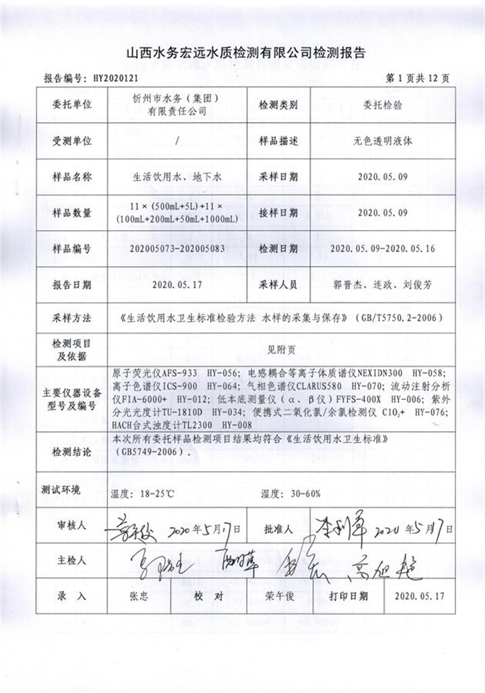 忻州城區(qū)公共供水水源水、出廠水、管網(wǎng)水、管網(wǎng)末梢水2020年5月份水質信息公示