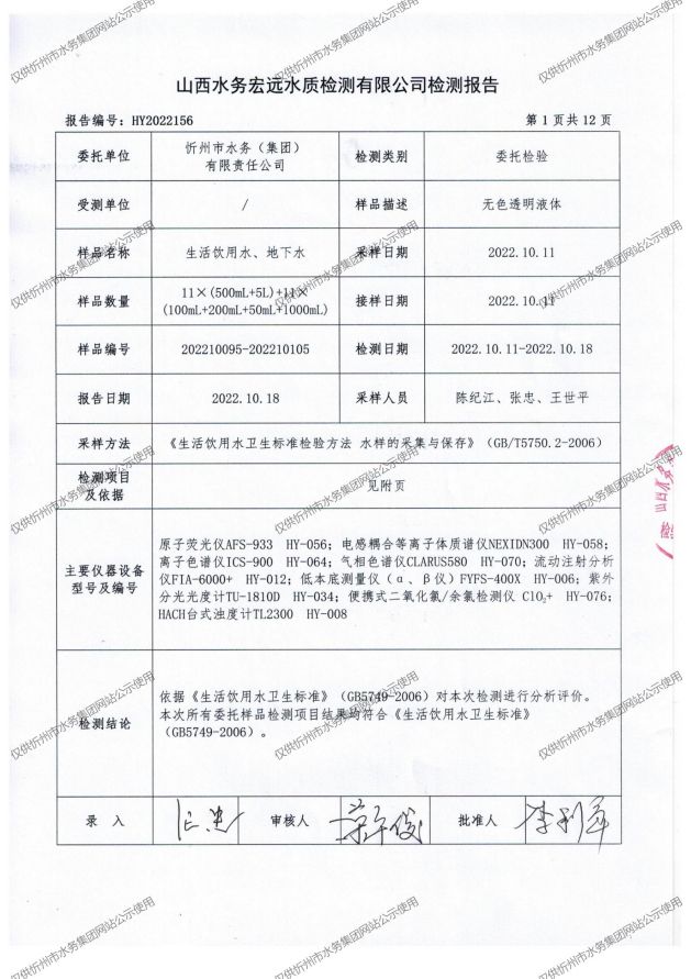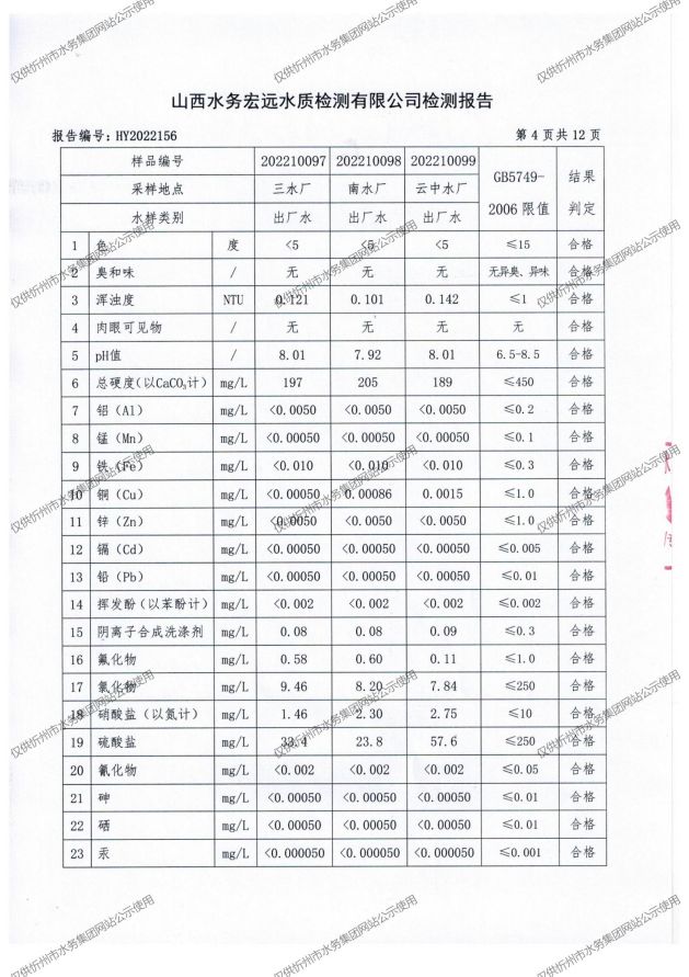 忻州城區(qū)公共供水水源水、出廠水、管網(wǎng)水、管網(wǎng)末梢水2022年10月份水質(zhì)信息公示